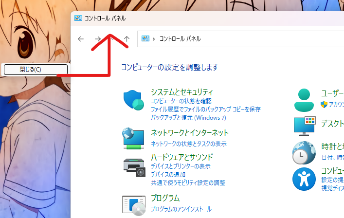 Altを押下すると、"閉じる" が表示されます。そのまま右キーを押します。すると、メニューが表示されます。