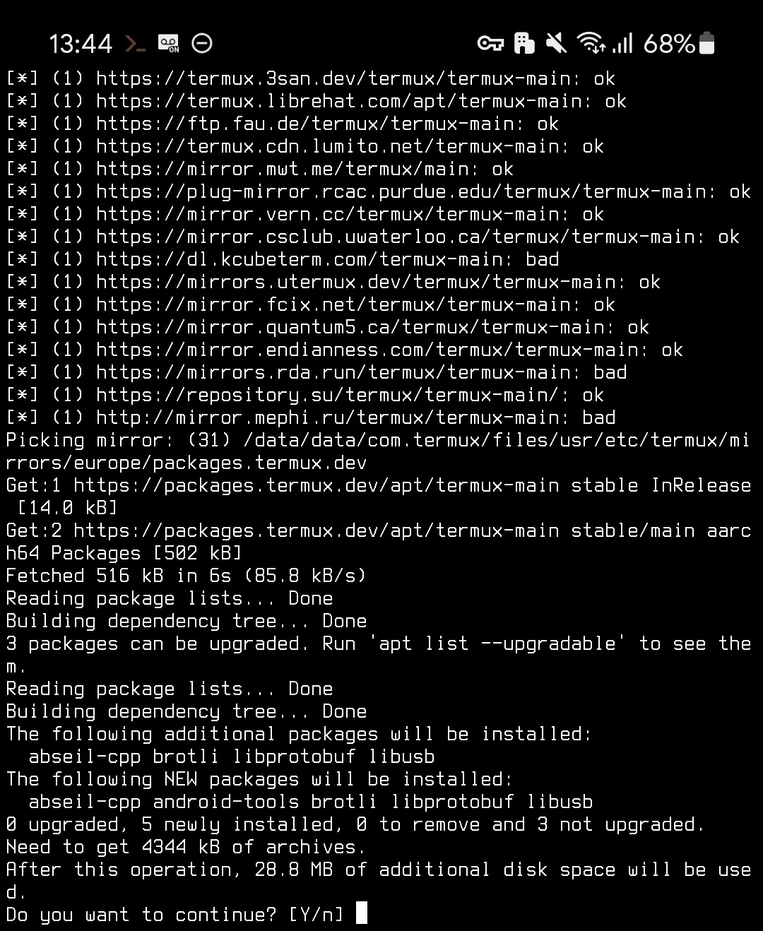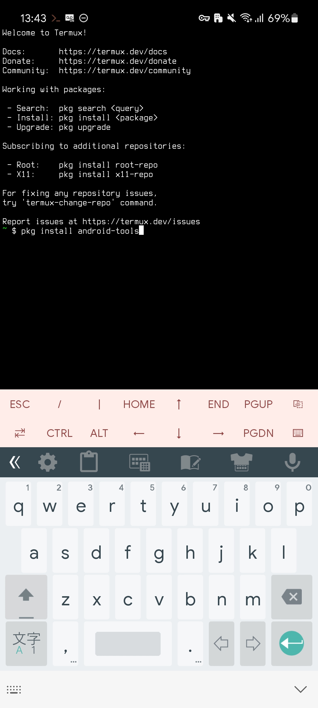 黒い画面に pkg install android-tools と入力して確定します。